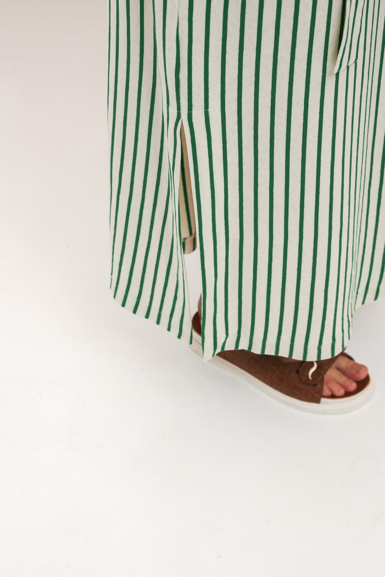 The JAMAICA maxi dress is soft and breathable with vertical green stripes on an off-white base. It features a relaxed fit, wide sleeves, and contrast trim details. A detachable belt cinches the waist, while side slits add comfort and ease. Finished with a chest “ARPYES” patch, it’s perfect for everyday cool.