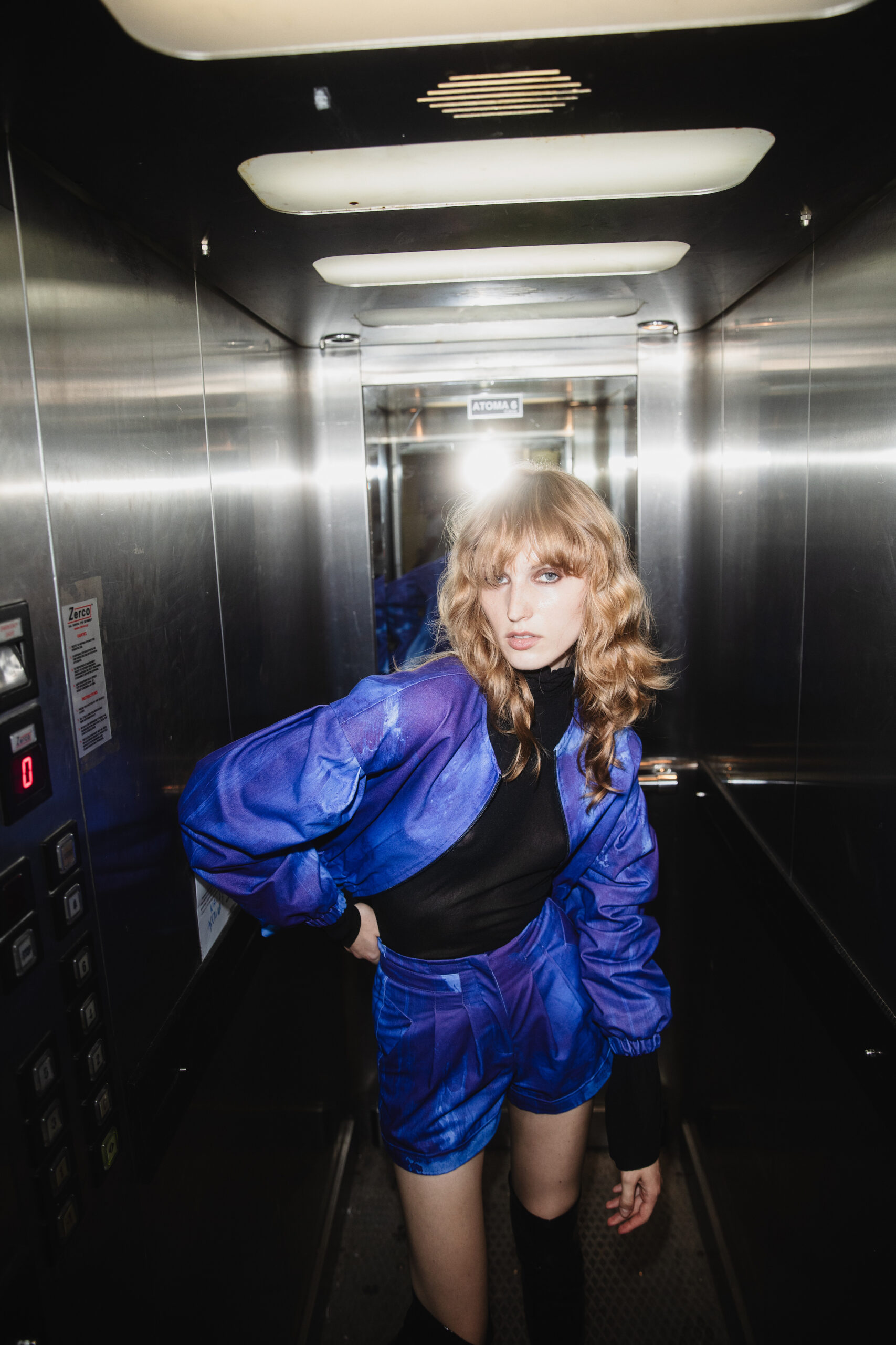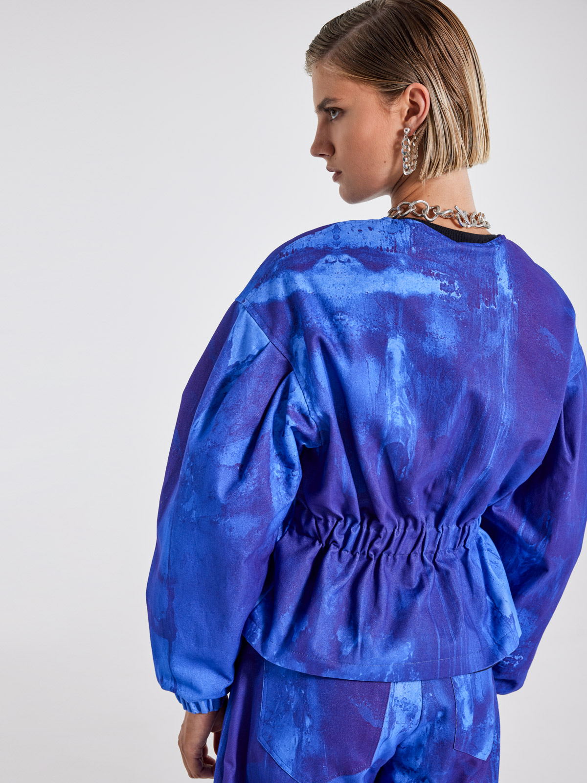 The Odell is made from cotton gabardine in our blue ‘Distressed Wall’ print. This simple yet striking silhouette features a sleek collarless neckline, architectural and voluminous sleeves, and a peplum waistband. It is finished with a center front zipper closure